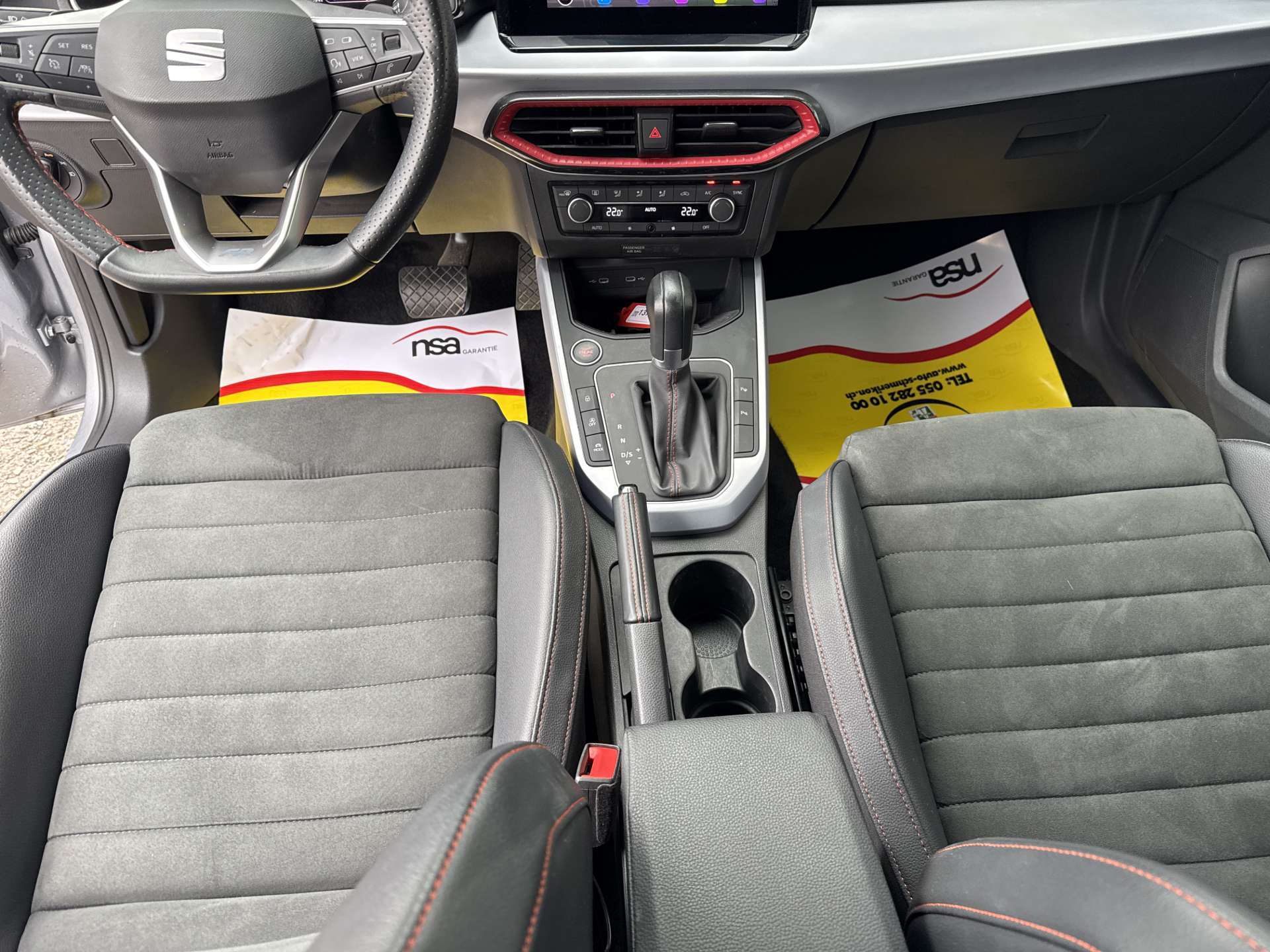 3-Punkt-Sicherheitsgurte auf allen Plätzen, 8.0" Digital Cockpit, 8.25'' Farbdisplay, Abgedunkelte Scheiben ab B-Säule hinten, Airbag: Beifahrerairbag deaktivierbar, Airbag: Fahrer und Beifahrer Airbag, Airbag: Seitenairbags und Kopfairbags vorne, Antiblockiersystem (ABS), Assist: Aufmerksamkeits- und Müdigkeitserkennung (ADA), Assist: Berganfahrhilfe (Hill Holder), Assist: Einparkhilfe hinten, Assist: Front-Assist, Assist: Licht- und Regensensor, Assist: Müdigkeitserkennung, Assist: Multifunktionskamera, Assist: Multikollisionsbremse, Assist: Spurhalteassistent Lane Assist, Assist: Tempomat, Assist: Traffic sign recognition (Verkehrszeichenerkennung), Aussenspiegel in Dachlackierung und Türgriffe in Wagenfarbe, Aussenspiegel rechts und links beheizt, elektrisch verstell-/ und einklappbar, Dach in Bicolor, Dachhimmel schwarz, Dachreling silber, Dekor: Dashbord in silber matt, Elektrische Fensterheber vorne und, Elektronische Differentialsperre (XDS), Elektronisches Stabilitäts-Programm, Fussmatten vorne und hinten, Getriebe: 7-Gang DSG, Heckscheiben-Wisch-Waschanlage mit Intervall, Heckscheibenheizung, Innenspiegel automatisch abblendbar, Katalysator geregelt, Kindersitzverankerung ISOFIX mit TopTether Vorbereitung (äussere Plätze hinten), Klima: 2-Zonen Climatronic, Lackierung: Uni-Lackierung, Lenkrad: Ledermultifunktionslenkrad, Lenkrad: Schaltwippen am Lenkrad für DSG, Licht: Bremslicht Drittes, Licht: Coming Leaving Home Funktion, Licht: Eco-LED Scheinwerfer, Licht: LED Heckleuchten, Licht: Nebelschlussleuchte, Licht: Tagfahrlicht, Luftausströmer beleuchtet weiss und rot (links und rechts), Luftausströmer in rot, Media: DAB+ (Digital Audio Broadcasting), Media: Lautsprecher 6, Media: Mobiltelefon Freisprecheinrichtung Bluetooth, Media: SEAT Connect Safety & Services für Media System, Media: SEAT FullLink, Media: SEAT Media System, Media: USB-Anschluss Typ C, Multifunktionsanzeige Medium, Paket: Komfortpaket, Polster: Stoff, Räder: Leichtmetallräder 6.5J x 17", "DYNAMIC", Räder: Reifendruckkontrollsystem, Scheibenbremsen hinten, Schriftzug "Handwriting-Optik", SEAT Drive Profile, Servolenkung, Sitze: Kopfstützen vorne und hinten, Sitze: Rücksitzlehne geteilt abklappbar, Sitze: Vordersitze höhenverstellbar, Wärmeschutzverglasung, Wegfahrsperre elektronisch, Zentralverriegelung mit Fernbedienung, Zierleisten Seitenfenster mit Alueinfassung glänzend