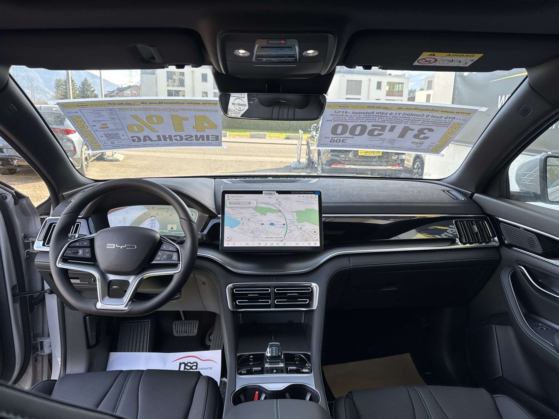 11kW On-Board Charger (OBC), 12-V-Stromanschluss, 2 x Smart Key, 4 x One-Touch-Fensterheber mit Einklemmschutzfunktion, Airbag: Fahrerairbag und Beifahrerairbag, Airbag: Frontairbag in der Mitte, Airbag: Seitenairbags vorn, Airbag: Vorhangairbags, Ambientebeleuchtung, mehrfarbig, Antiblockiersystem (ABS), Armlehne hinten, 2 Getränkehalter, Assist: Spurverlassenswarnung (LDW), Assist: 360° view camera, Assist: Adaptive Geschwindigkeitsregelung (ACC) & Intelligente Geschwindigkeitsregelung (ICC), Assist: Auto Hold, Assist: Automatische Notbremsung (AEB), Assist: Bergabfahrhilfe (HDC), Assist: Berganfahrassistent (HSA), Assist: Comfort Stop (CST), Assist: Elektrische Parkbremse (EPB), Assist: Heckkollisionswarnung (RCW), Assist: Hydraulischer Bremsassistent (HBA), Assist: Kindererkennung (CPD), Assist: Kontrollierte Verzögerung mit Feststellbremse (CDP), Assist: Müdigkeitserkennung für den Fahrer (DFW) und Aufmerksamkeitswarnung für den Fahrer (DFW), Assist: Parksensoren vorne und hinten, Assist: Querverkehrswarnung hinten (RCTA) & Querverkehrsbremse hinten (RCTB), Assist: Querverkehrswarnung vorn (FCTA) & Querverkehrsbremse vorn (FCTB), Assist: Spurhalteassistent (ELKA), Assist: Spurverlassensverhinderung (LDP), Assist: Spurwechselassistent (LCA), Assist: Toter-Winkel-Warnung (BSD), Assist: Traktionskontrolle (TCS), Assist: Überschlagskontrollsystem (RMI), Assist: Verkehrszeichenerkennung (TSR), Assist: Vorwärtskollisionswarnung (FCW), Aussenspiegel elektrisch verstellbar, elektrisch anklappbar, beheizbar, Automatisch abblendender Rückspiegel, Automatisches Verriegelungssystem, Bodenbeleuchtung vorne, Bremsüberbrückungssystem (BOS), Dachreling in Aluminium, Diebstahlsicherung, Dynamische Blinker, Elektrische Heckklappe, Elektronische Bremskraftverteilung (EBD), Elektronische Kindersicherung, ESP (Elektronisches Stabilitätsprogramm), Fahrmodus: Eco, Normal, Sport, Snow, Fahrwerk: Fahrdynamikregelung (VDC), Frontscheibe, Scheibenwischer mit Regensensor, Frontscheibe, UV-Schutz, Wärmedämmung, Schalldämmung, Fussraumbeleuchtung in den Aussenspiegeln, Garantie: Batterie-Garantie 8 Jahre oder 200'000 km, Garantie: Garantie 6 Jahre oder 150'000 km, Gepäckraumleuchte, Getriebe: Direktantrieb, kein Getriebe, Head-up-Display (HUD), ISOFIX und i-Size, Beifahrer- und äussere Rücksitze, Keyless entry & keyless start, Kindersicherung manuell, Klima: Belüftungsdüsen hinten, Kofferraum-Gepäckablage, Kraftbegrenzender Sicherheitsgurt auf dem mittleren Rücksitz, Lackierung: Metallic-Lackierung, LED-Leseleuchten hinten, LED-Leseleuchten vorn, Licht: Fernlichtassistent (HMA), Licht: Follow-me-Home, Licht: LED-Rückleuchten, Licht: LED-Scheinwerfer, automatisches Ein-/Ausschalten, Licht: LED-Tagfahrlicht, Licht: Nebelschlussleuchten, Media: 12,3" TFT-LCD-Instrumententafel, Media: 15,6" elektrisch drehbarer Touchscreen, Media: Android Auto & Apple CarPlay, Media: DAB+ & FM, Media: Infinity-Soundsystem, 10 Lautsprecher, Media: Integrierte 4G-Konnektivität2, Media: Intelligente Sprachsteuerung "Hallo, BYD", Media: Smartphone wireless charging, 2x 15 W, Media: USB-Anschlüsse hinten: 1 x 18W Typ C, 1 x 60 W Typ C, Media: USB-Anschlüsse vorn: 1 x 18W Typ C, 1 x 60 W Typ C, Mehrfarbige LED-Ladeanzeige, Mittelarmlehne hinten, 2 Getränkehalter, Mittelarmlehne vorn, 2 Getränkehalter, Notruf, Panoramadach, elektrisch verstellbares Sonnenschutzrollo, PM2.5 filter, PM2.5-Luftreinigungssystem, Privacy glass in fond, Räder: 19" Bicolor- Leichtmetallfelgen, Reifendruckkontrolle (TPMS), Servolenkung, Sitze: Beifahrersitz belüftet, beheizt, Sitze: Beifahrersitz, elektrisch verstellbar, 4-fach, Sitze: Fahrersitz belüftet, beheizt, gespeicherte Einstellung, Sitze: Fahrersitz und Beifahrer, integrierte Kopfstütze, Sitze: Fahrersitz, elektrisch verstellbar, 8-fach, Positionsspeicher, Sitze: Rücksitze 40:60 geteilt umklappbar, Sitze: Rücksitze, manuell einstellbare Kopfstütze, Türöffnungswarnung (DOW), Vier LED-Türleuchten, Vordersitz-Sonnenblenden mit beleuchtetem Schminkspiegel, Vorgespannte und kraftbegrenzende Sicherheitsgurte vorn, Wärmepumpe