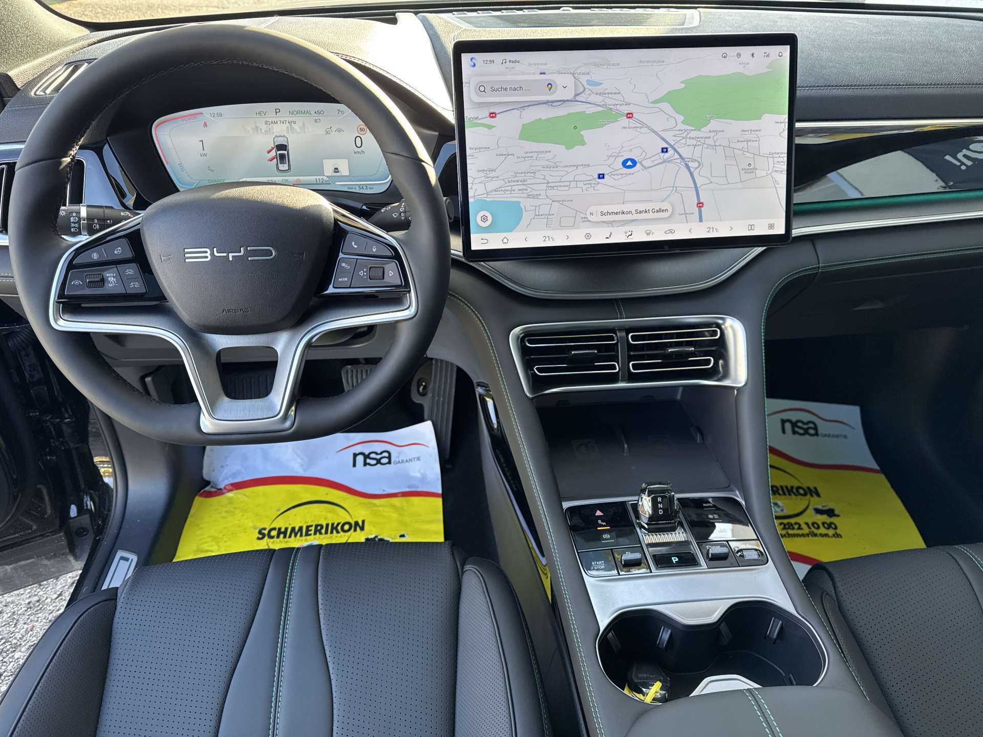 11kW On-Board Charger (OBC), 12-V-Stromanschluss, 2 x Smart Key, 4 x One-Touch-Fensterheber mit Einklemmschutzfunktion, Airbag: Fahrerairbag und Beifahrerairbag, Airbag: Frontairbag in der Mitte, Airbag: Seitenairbags vorn, Airbag: Vorhangairbags, Ambientebeleuchtung, mehrfarbig, Antiblockiersystem (ABS), Armlehne hinten, 2 Getränkehalter, Assist: 360° view camera, Assist: Adaptive Geschwindigkeitsregelung (ACC) & Intelligente Geschwindigkeitsregelung (ICC), Assist: Auto Hold, Assist: Automatische Notbremsung (AEB), Assist: Bergabfahrhilfe (HDC), Assist: Berganfahrassistent (HSA), Assist: Comfort Stop (CST), Assist: Elektrische Parkbremse (EPB), Assist: Heckkollisionswarnung (RCW), Assist: Hydraulischer Bremsassistent (HBA), Assist: Kindererkennung (CPD), Assist: Kontrollierte Verzögerung mit Feststellbremse (CDP), Assist: Müdigkeitserkennung für den Fahrer (DFW) und Aufmerksamkeitswarnung für den Fahrer (DFW), Assist: Parksensoren vorne und hinten, Assist: Querverkehrswarnung hinten (RCTA) & Querverkehrsbremse hinten (RCTB), Assist: Querverkehrswarnung vorn (FCTA) & Querverkehrsbremse vorn (FCTB), Assist: Spurhalteassistent (ELKA), Assist: Spurverlassensverhinderung (LDP), Assist: Spurverlassenswarnung (LDW), Assist: Spurwechselassistent (LCA), Assist: Toter-Winkel-Warnung (BSD), Assist: Überschlagskontrollsystem (RMI), Assist: Verkehrszeichenerkennung (TSR), Assist: Vorwärtskollisionswarnung (FCW), Aussenspiegel elektrisch verstellbar, elektrisch anklappbar, beheizbar, Automatisch abblendender Rückspiegel, Automatisches Verriegelungssystem, Bodenbeleuchtung vorne, Bremsüberbrückungssystem (BOS), Dachreling in Aluminium, Diebstahlsicherung, Dynamische Blinker, Elektrische Heckklappe, Elektronische Bremskraftverteilung (EBD), Elektronische Kindersicherung, ESP (Elektronisches Stabilitätsprogramm), Fahrmodus: Eco, Normal, Sport, Snow, Fahrwerk: Fahrdynamikregelung (VDC), Frontscheibe, Scheibenwischer mit Regensensor, Frontscheibe, UV-Schutz, Wärmedämmung, Schalldämmung, Fußraumbeleuchtung in den Außenspiegeln, Garantie: Batterie-Garantie 8 Jahre oder 200'000 km, Garantie: Garantie 6 Jahre oder 150'000 km, Gepäckraumleuchte, Getriebe: Direktantrieb, kein Getriebe, Head-up-Display (HUD), ISOFIX und i-Size, Beifahrer- und äußere Rücksitze, Keyless entry & keyless start, Kindersicherung manuell, Klima: Belüftungsdüsen hinten, Kofferraum-Gepäckablage, Kraftbegrenzender Sicherheitsgurt auf dem mittleren Rücksitz, Lackierung: Metallic-Lackierung, LED-Leseleuchten hinten, LED-Leseleuchten vorn, Licht: Fernlichtassistent (HMA), Licht: Follow-me-Home, Licht: LED-Rückleuchten, Licht: LED-Scheinwerfer, automatisches Ein-/Ausschalten, Licht: LED-Tagfahrlicht, Licht: Nebelschlussleuchten, Media: 12,3" TFT-LCD-Instrumententafel, Media: 15,6" elektrisch drehbarer Touchscreen, Media: Android Auto & Apple CarPlay3, Media: DAB+ & FM, Media: Infinity-Soundsystem, 10 Lautsprecher, Media: Integrierte 4G-Konnektivität2, Media: Intelligente Sprachsteuerung "Hallo, BYD", Media: Smartphone wireless charging, 2x 15 W, Media: USB-Anschlüsse hinten: 1 x 18W Typ C, 1 x 60 W Typ C, Media: USB-Anschlüsse vorn: 1 x 18W Typ C, 1 x 60 W Typ C, Mehrfarbige LED-Ladeanzeige, Mittelarmlehne hinten, 2 Getränkehalter, Mittelarmlehne vorn, 2 Getränkehalter, Notruf, Panoramadach, elektrisch verstellbares Sonnenschutzrollo, PM2.5 filter, PM2.5-Luftreinigungssystem, Privacy glass in fond, Räder: 19" Bicolor- Leichtmetallfelgen, Reifendruckkontrolle, Servolenkung, Sitze: Beifahrersitz belüftet, beheizt, Sitze: Beifahrersitz, elektrisch verstellbar, 4-fach, Sitze: Fahrersitz belüftet, beheizt, gespeicherte Einstellung, Sitze: Fahrersitz und Beifahrer, integrierte Kopfstütze, Sitze: Fahrersitz, elektrisch verstellbar, 8-fach, Positionsspeicher, Sitze: Rücksitze 40:60 geteilt umklappbar, Sitze: Rücksitze, manuell einstellbare Kopfstütze, Traktionskontrolle (TCS), Türöffnungswarnung (DOW), Vier LED-Türleuchten, Vordersitz-Sonnenblenden mit beleuchtetem Schminkspiegel, Vorgespannte und kraftbegrenzende Sicherheitsgurte vorn, Wärmepumpe